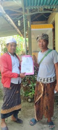 Kadus Merta Sari menyerahkan dokumen penting kepada pihak keluarga yang berduka. Dokumen tersebut adalah akta kematian atas nama Nengah Latri.Penyerahan dokumen ini menandai langkah penting dalam proses administrasi setelah kepergian almarhum. Dengan diterimanya akta kematian oleh pihak keluarga, mereka dapat melanjutkan proses yang diperlukan untuk mengurus berbagai kepentingan yang terkait dengan status almarhum.